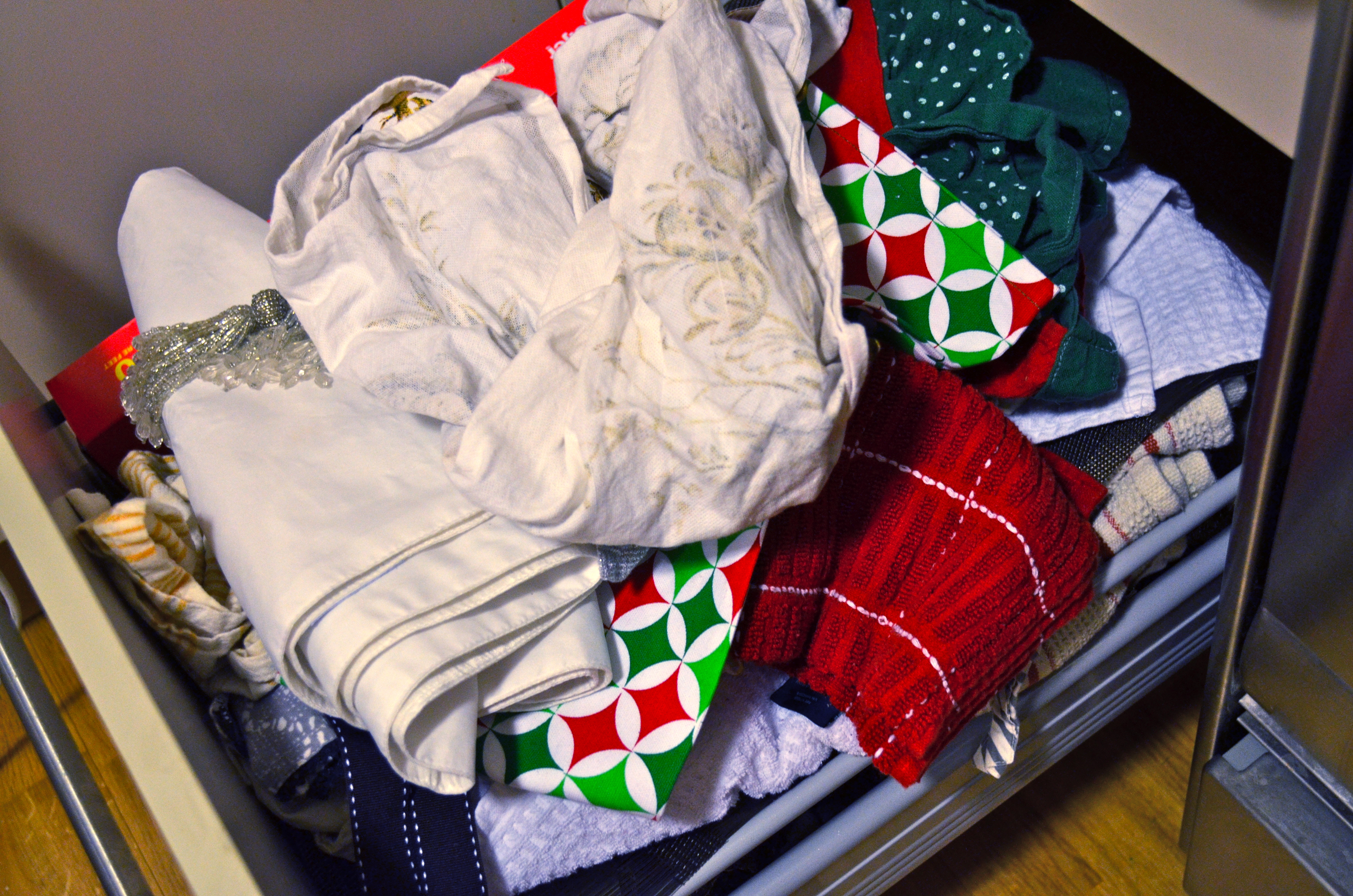Now, anyone who knows us, knows that we are messy. We both like to think that we are organized and tidy people who sometimes make messes. We are not those people. We are a mess. ALWAYS. So this should not have bothered me. However, sometimes my husband can get really overwhelmed with some of my….collections. If he sees this drawer we will have the inevitable conversation that sounds something like this, “Husband: Do we seriously need these weird towels for every single holiday? They dont even work when you are trying to soak something up. Why do we have to have a zillion sets of napkin rings?! A turkey towel? Seriously?! This is stupid. I am throwing all of this away.” To be proactive I had to figure out how to fit all of this stuff in this teeny tiny drawer and make it look like it wasn’t full at all.