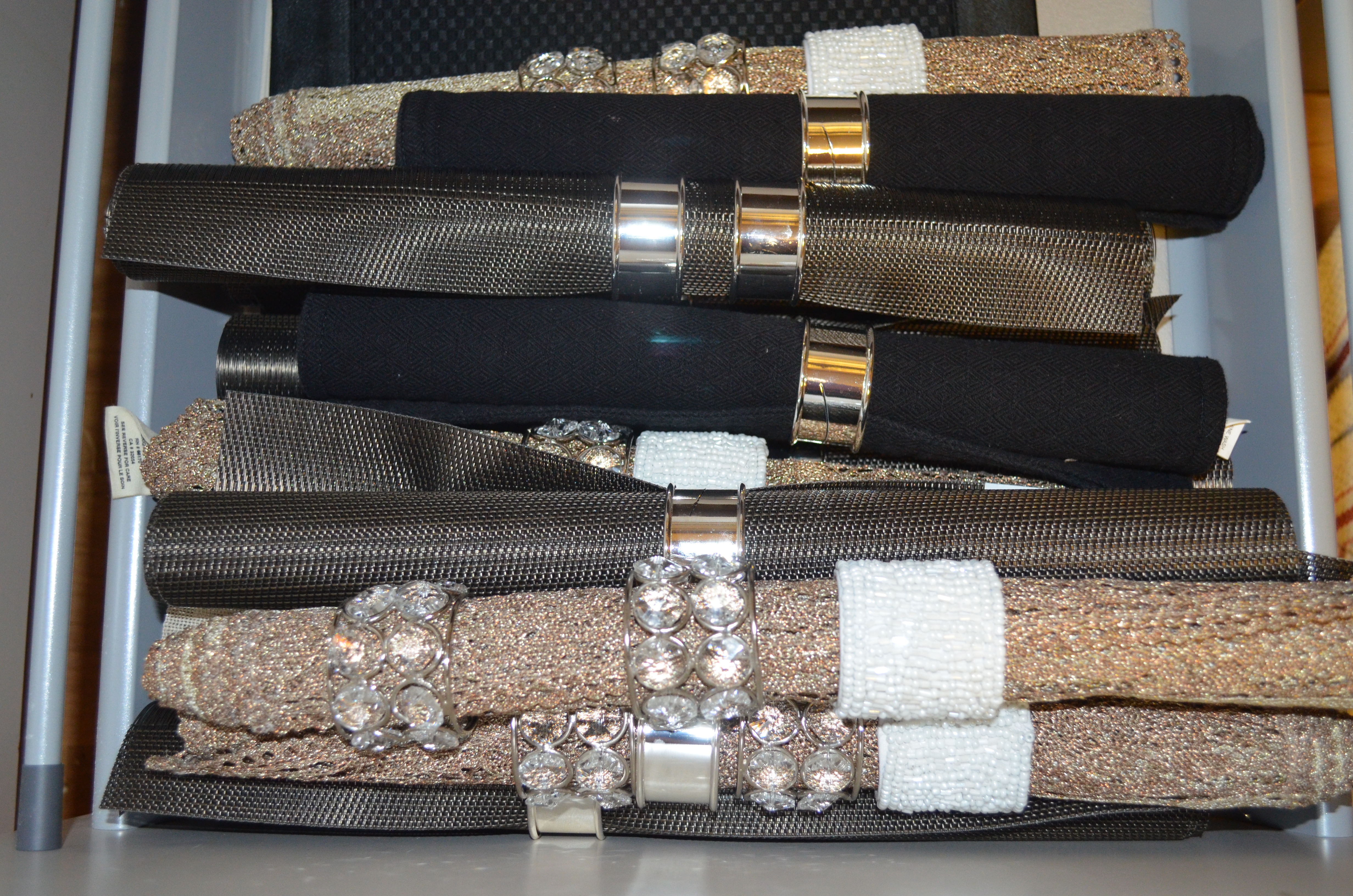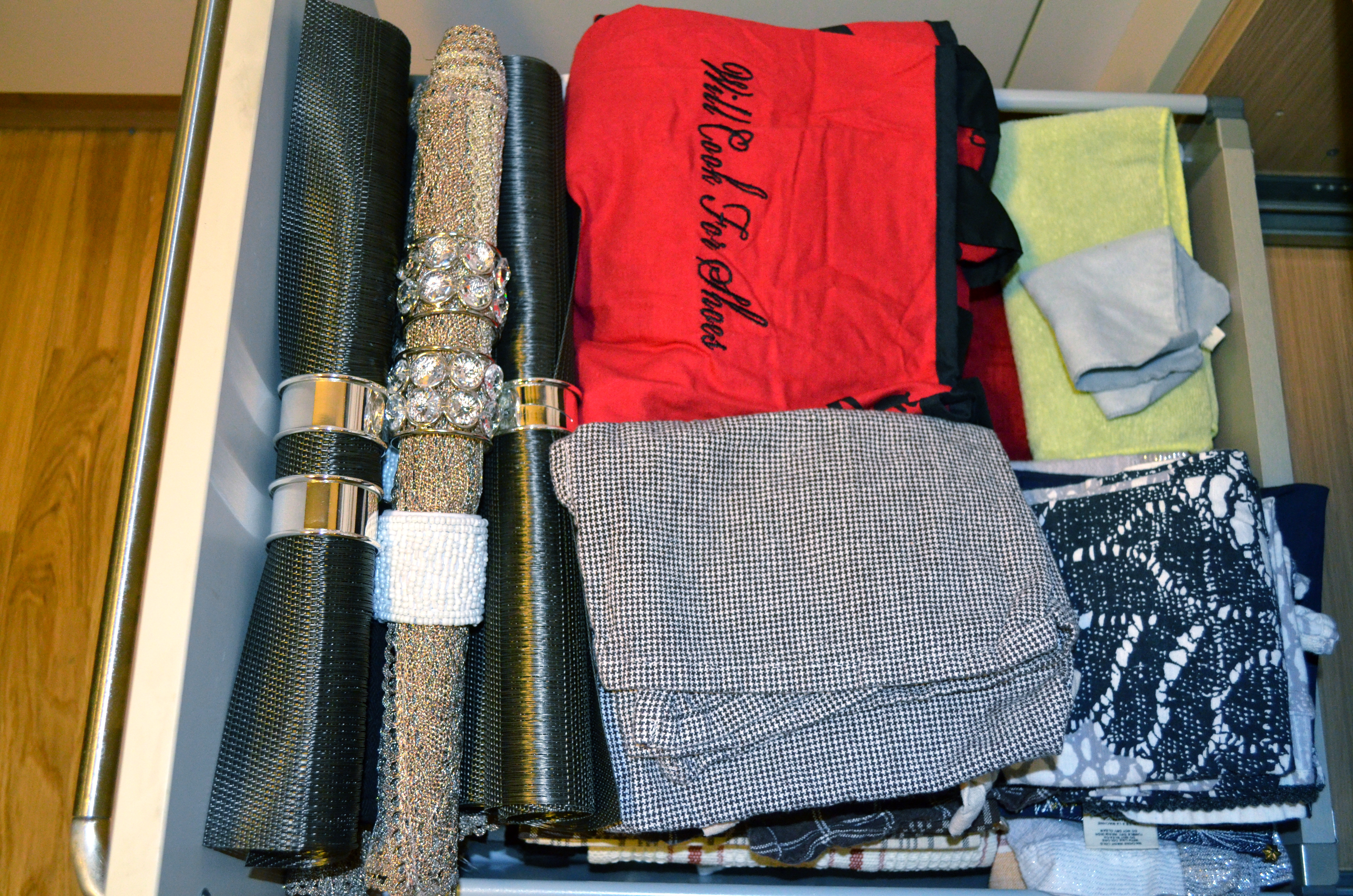 I started with all of the placemats we got from the wedding. I rolled each one of them up and secured them with a couple napkin rings. I realize they could have just laid flat in the drawer but the second I need to use them, the entire drawer looks like a bomb went off and I am back to square one.