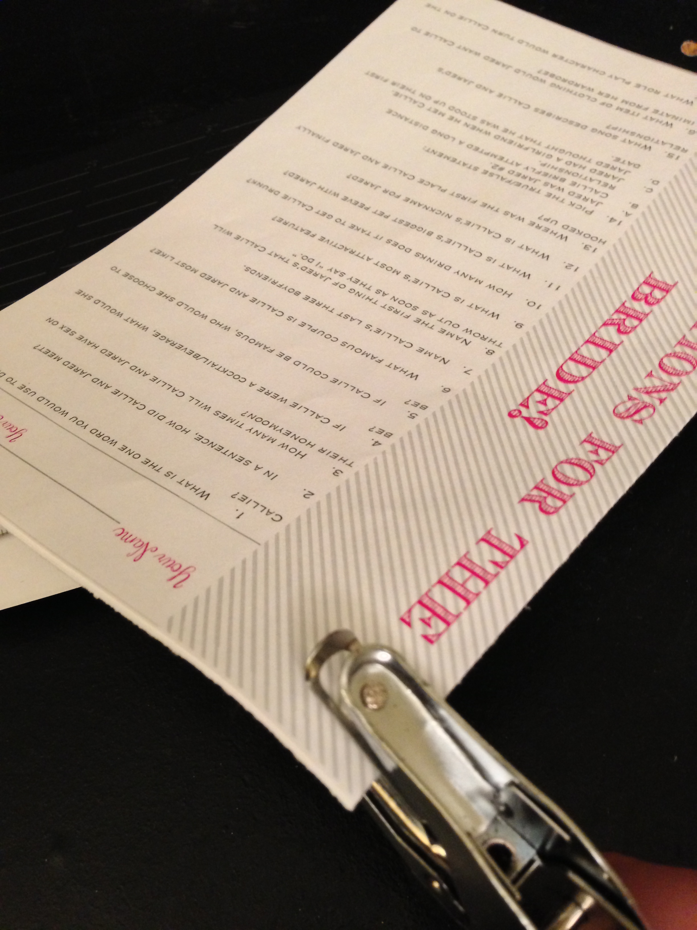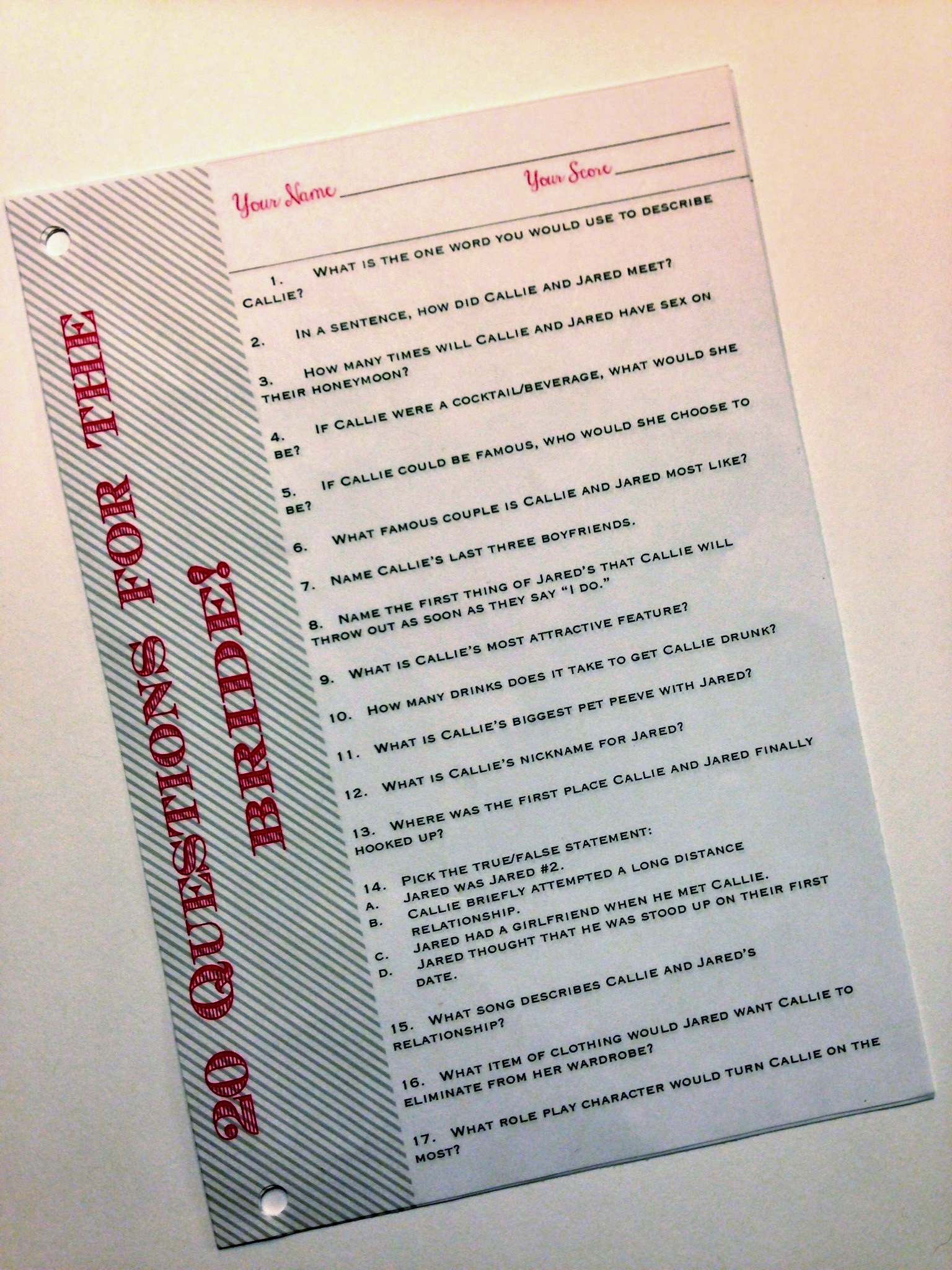 Many of you have heard of 20 questions, right? Well we created a little printout and had each guest fill it out upon arrival. They had to answer all twenty questions about the bride and groom. After everyone had finished we called the bride up to the front of the room and had her give her answers to each question. There was a twist too; we had a stealth bridesmaid pre-record all of the groom’s answers to the questions before so we could play them as the bride answered them herself. We needed to compare the answers right?! If your answer matched the bride or the groom’s answer you get a point. Because we punched holes in each sheet before guests started filling it out, we were able to (quickly) make a cute little book for the bride after we played to take home as a keepsake. For the cover, I just used two pieces of cardstock cut to size and the left over scraps from punching all of those holes in the striped pages. I tied it all together with ribbon and called it a day!