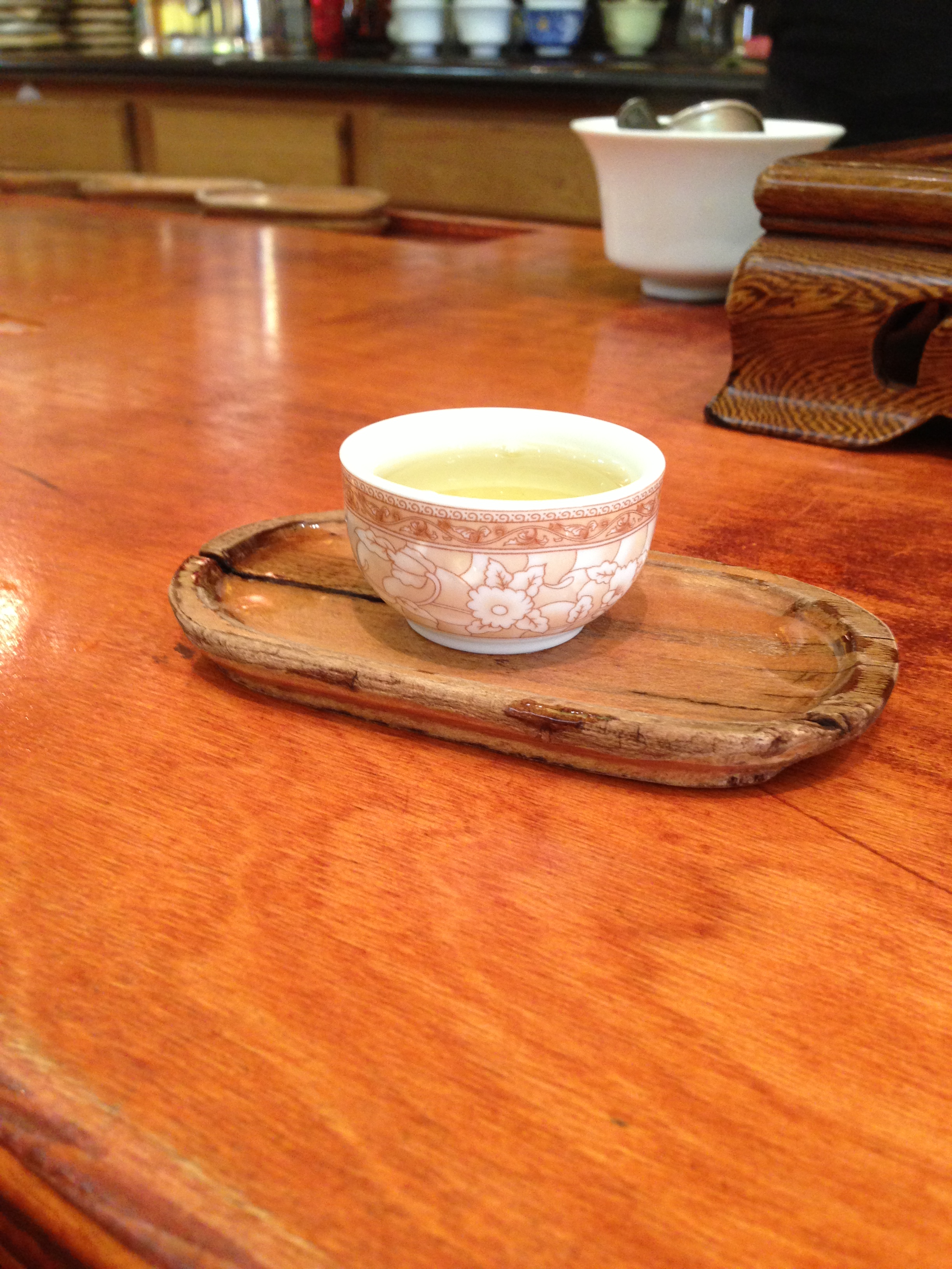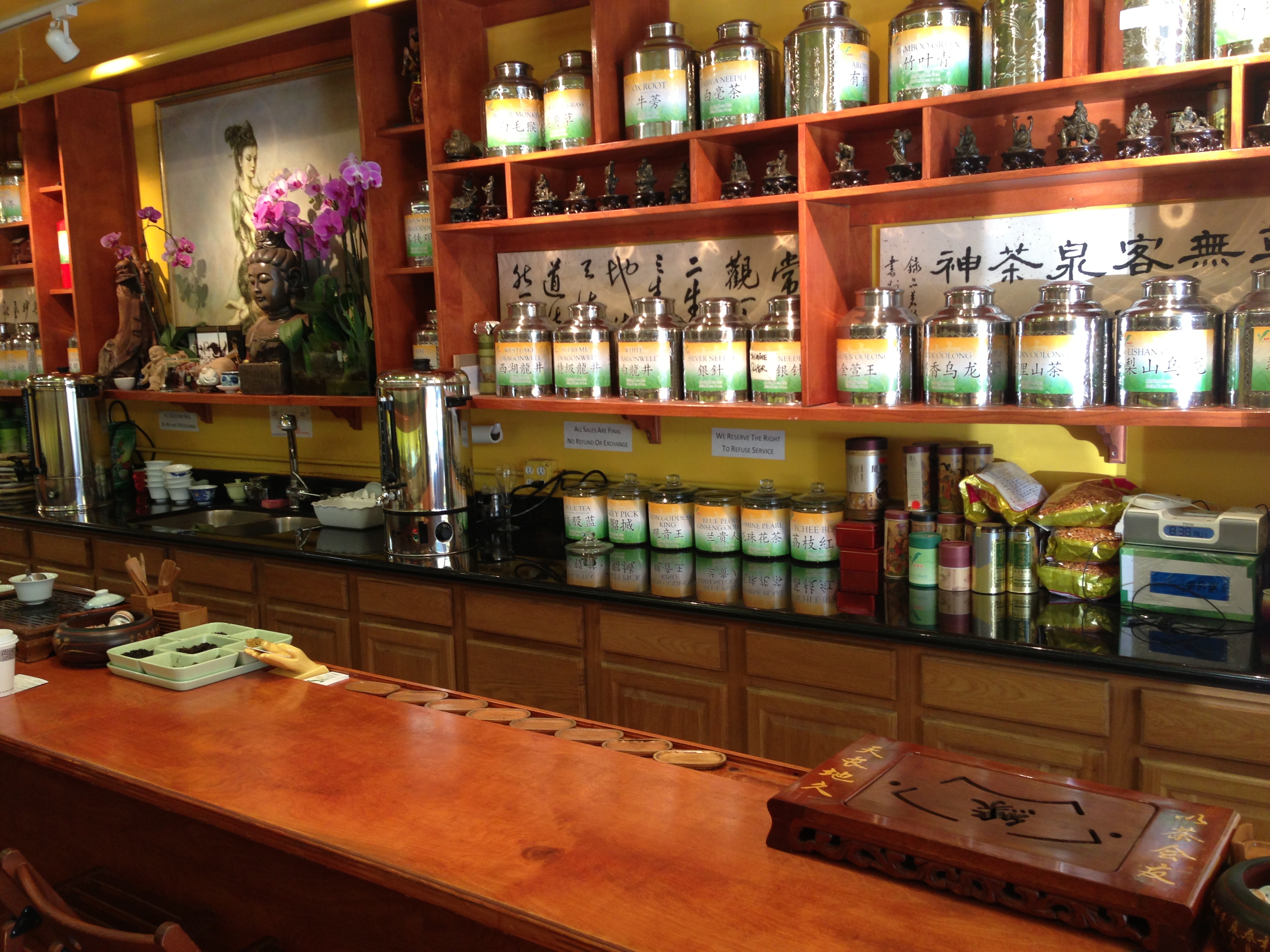 We walked up and down the streets for a while and then ended up seeing a sign for free tea tastings at a place called Vital Tea Leaf on Grant street near Washington. Â This really nice lady showed us how to brew the tea and the process you have to use. Â Did you know that you need to rinse loose tea? Â I didn’t! Â When the farmers are picking the leaves they just pick them and throw them on the floor where they get collected. Â So there can be dust and yucky stuff on your tea so you have to pour in hot water stir it around for about 20 seconds to open up the leaves and then dump out that water and start over with fresh water. Â Then you just steep the leaves for about 20-30 seconds and then pour it in your cup and enjoy!