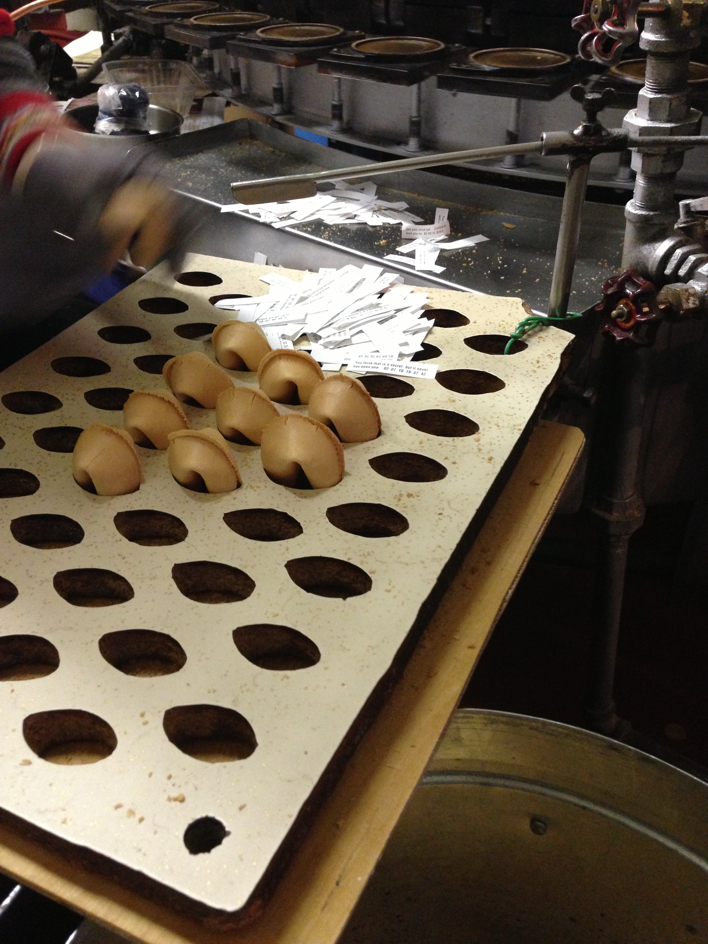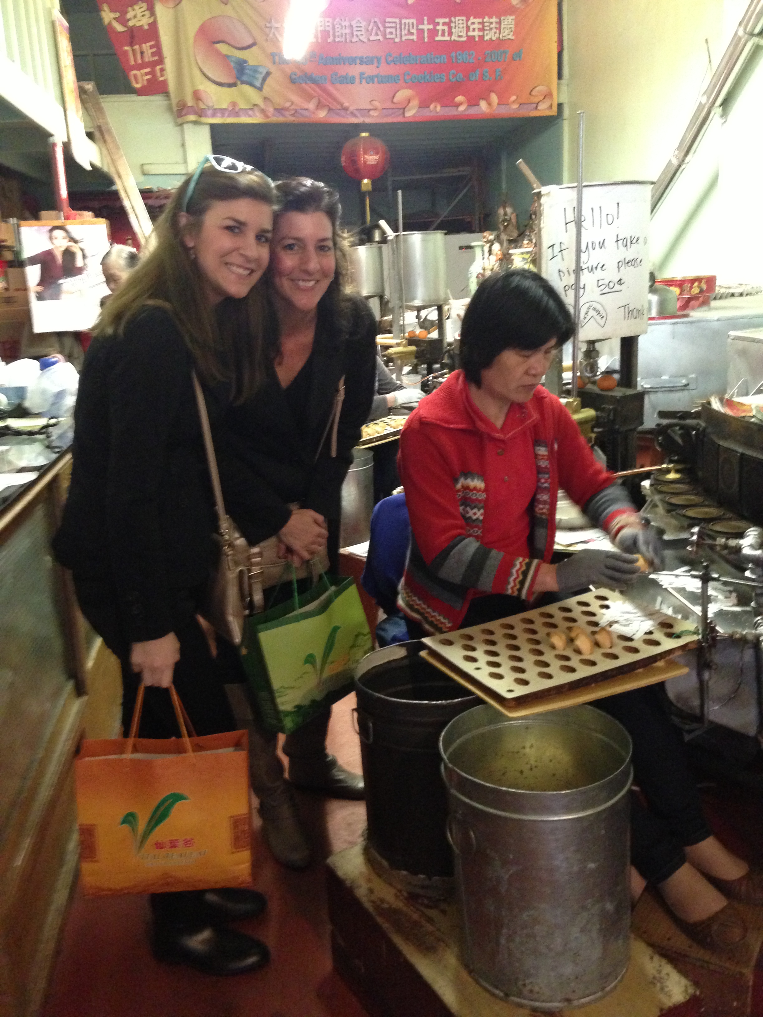 After we bought a bunch of tea, we asked the lady where else we should go and she told us about the fortune cookie factory that was in the alley behind us. Â It is called the Golden Gate Fortune Cookie Factory and you can literally see the machines they use to make the cookies and the little chinese ladies who put the paper in and fold them. Â It was quite the experience.