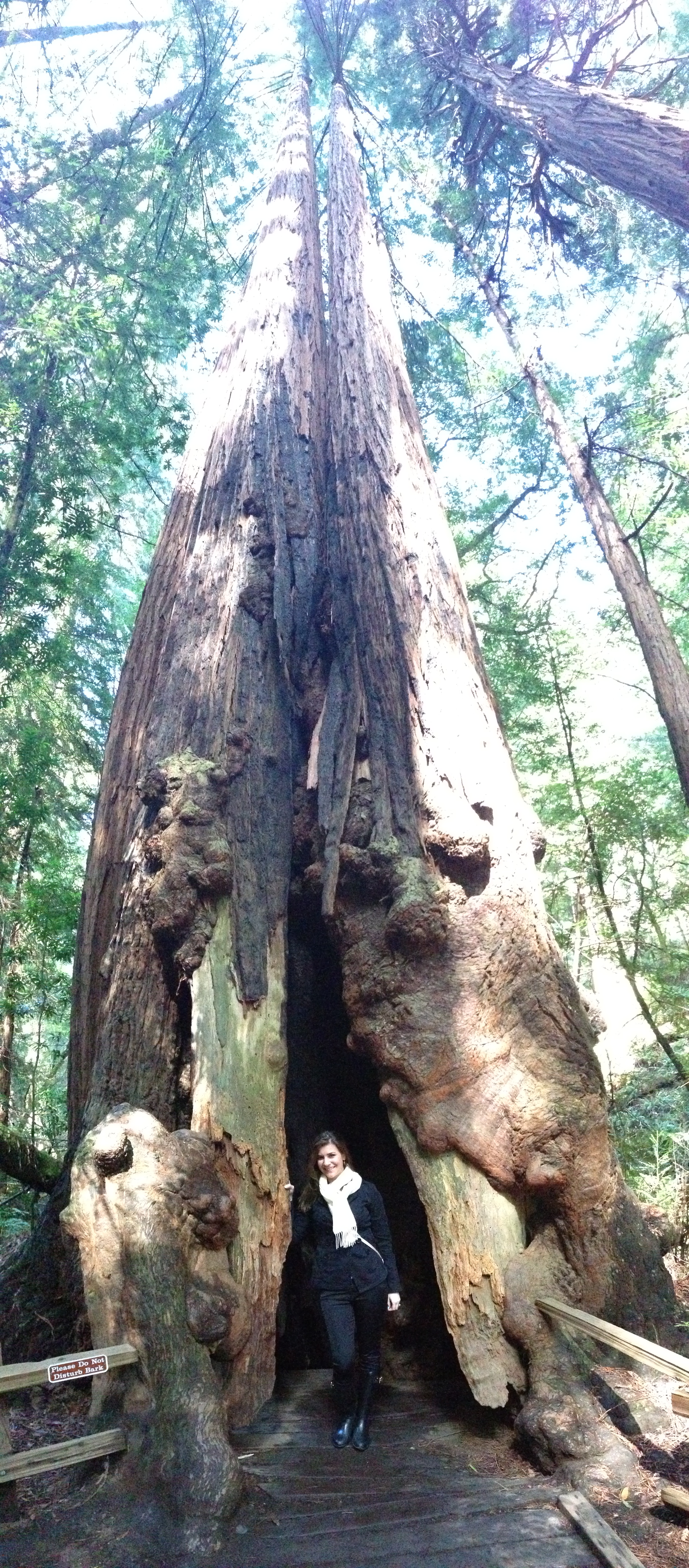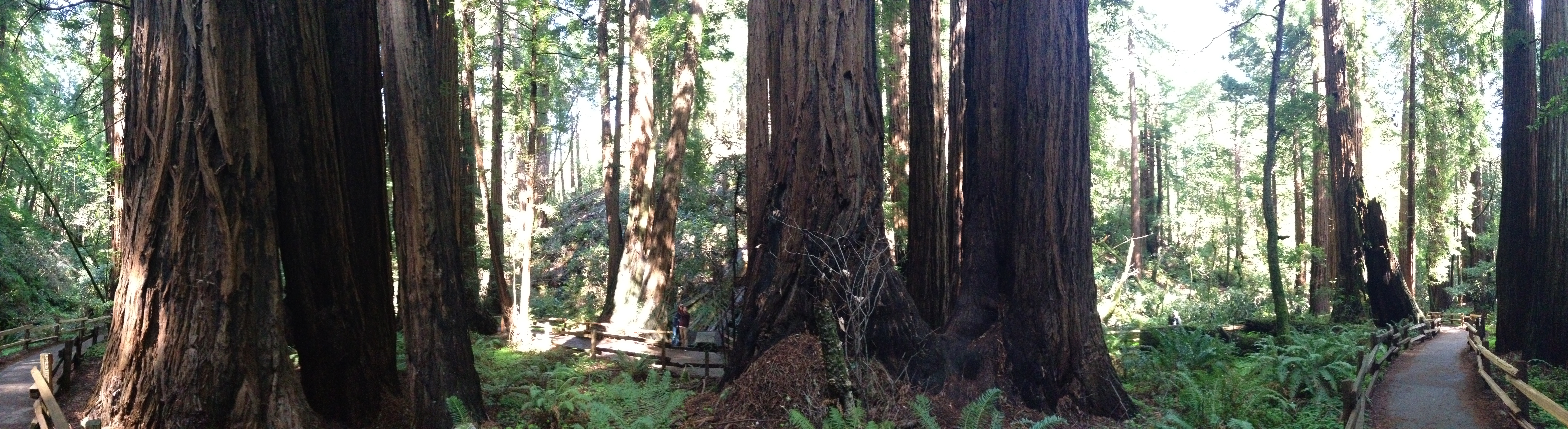 So then, we made our way to Muir woods to see the Famous redwood trees. Â Now, for some reason, I had it in my head that the trees we were going to see would be those gargantuan wide trees that you can drive a bus through. Â These are not those trees. Â Those are also Redwoods, but they are in Yosemite and a different kind. Â The kind of redwoods we were going to see are the really, really tall ones, not the really, really fat ones. Â But once we got there, it was really nice spending some time outside. Â These trees really are humongous.